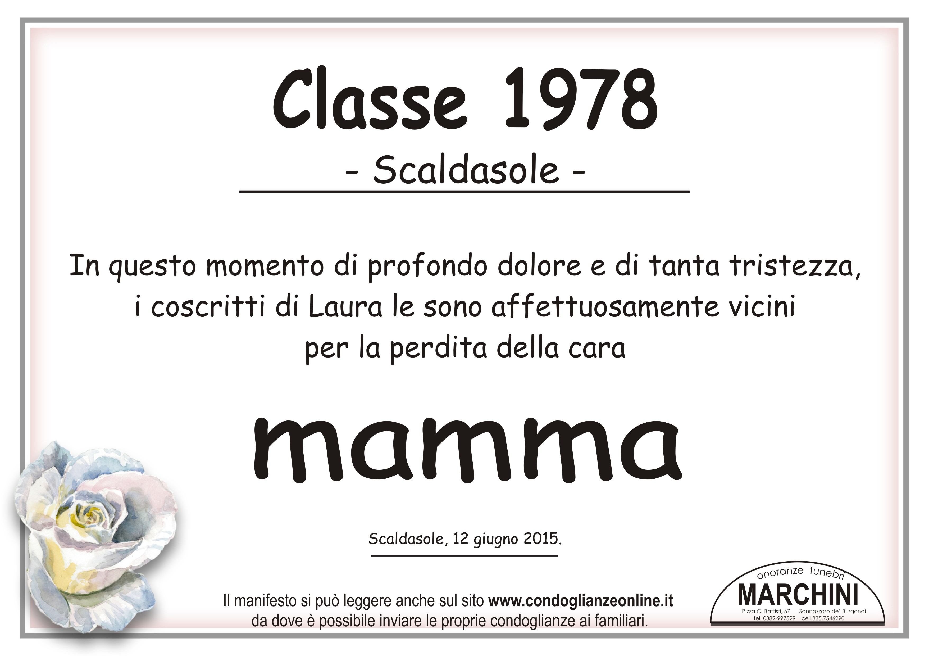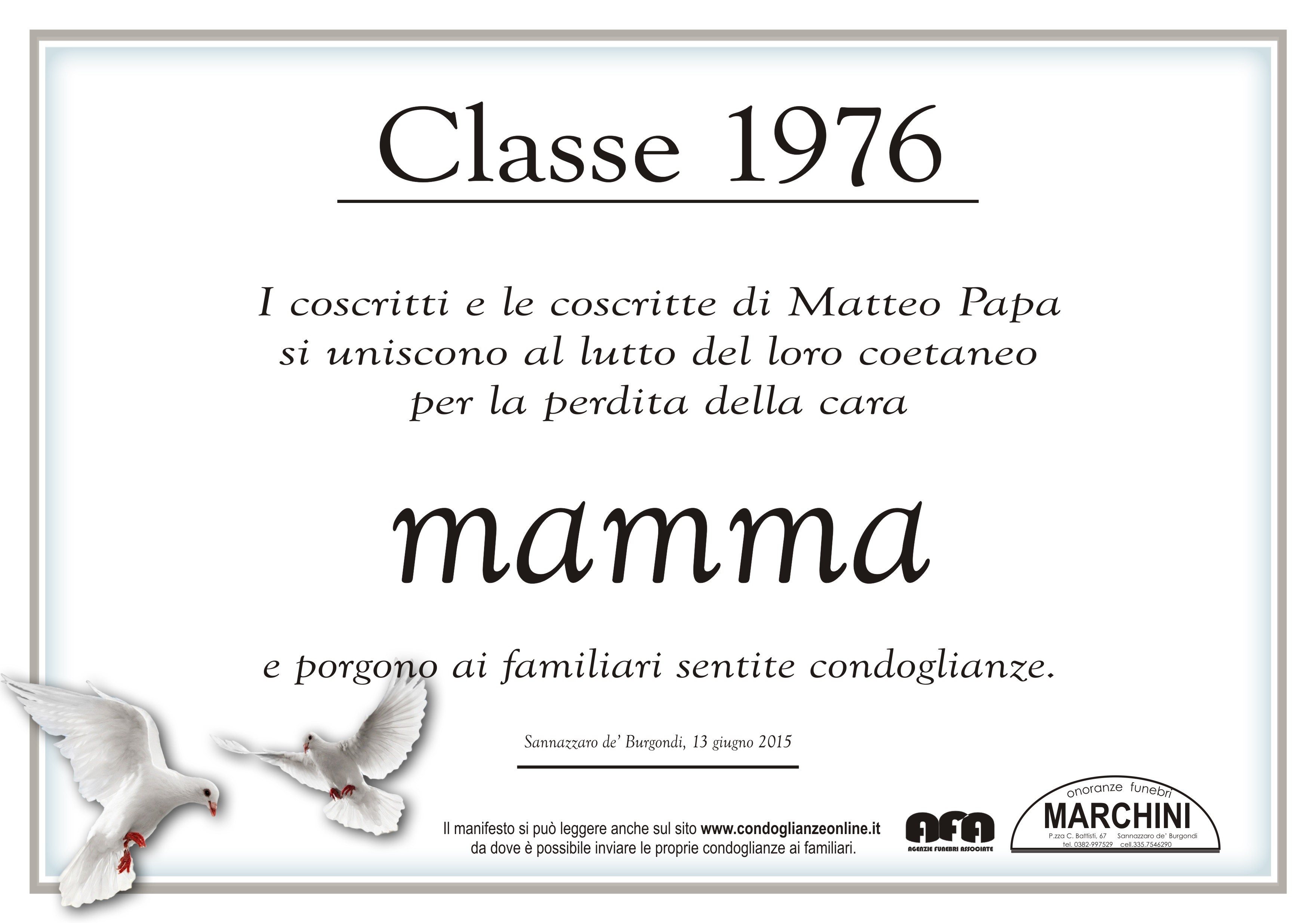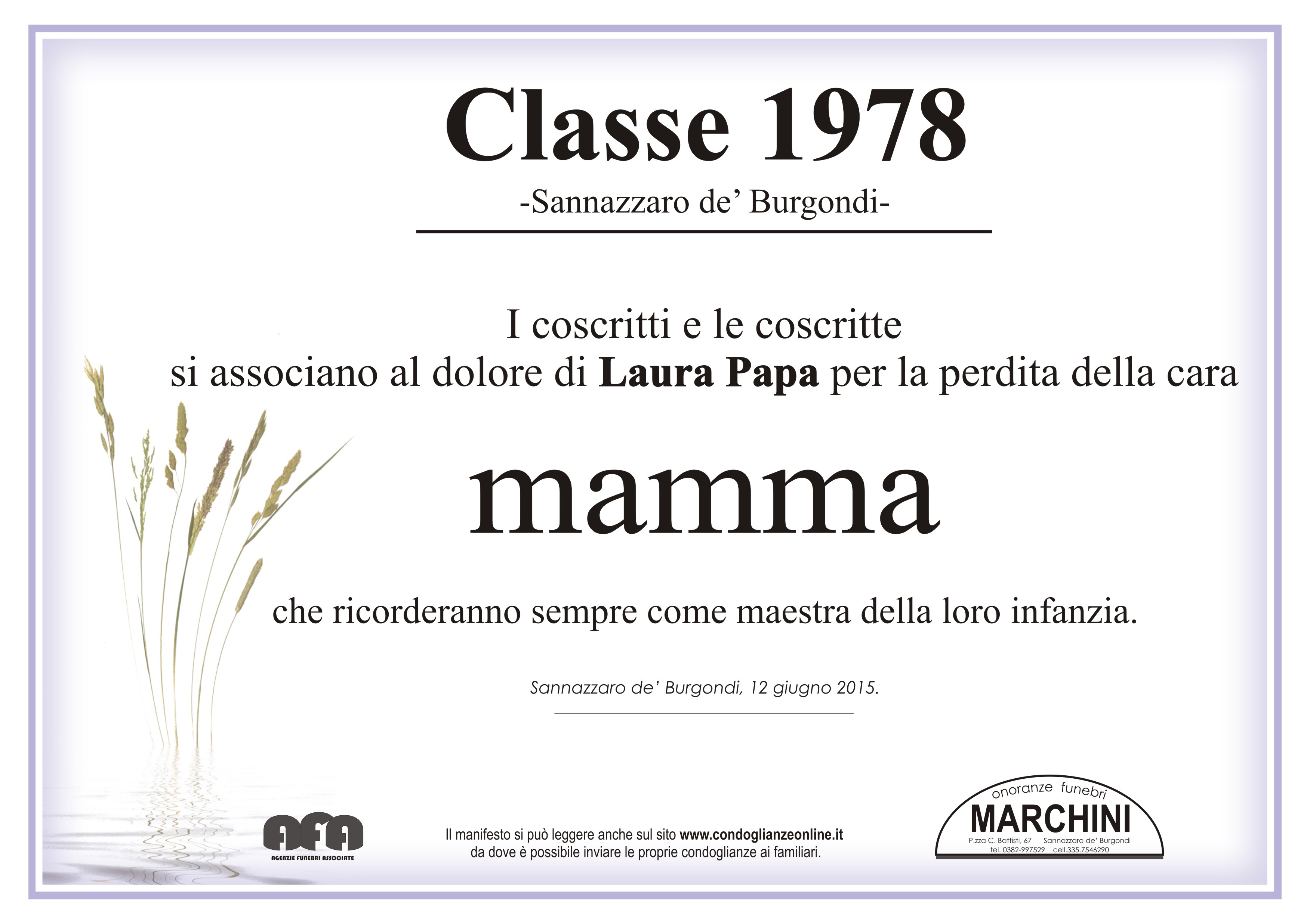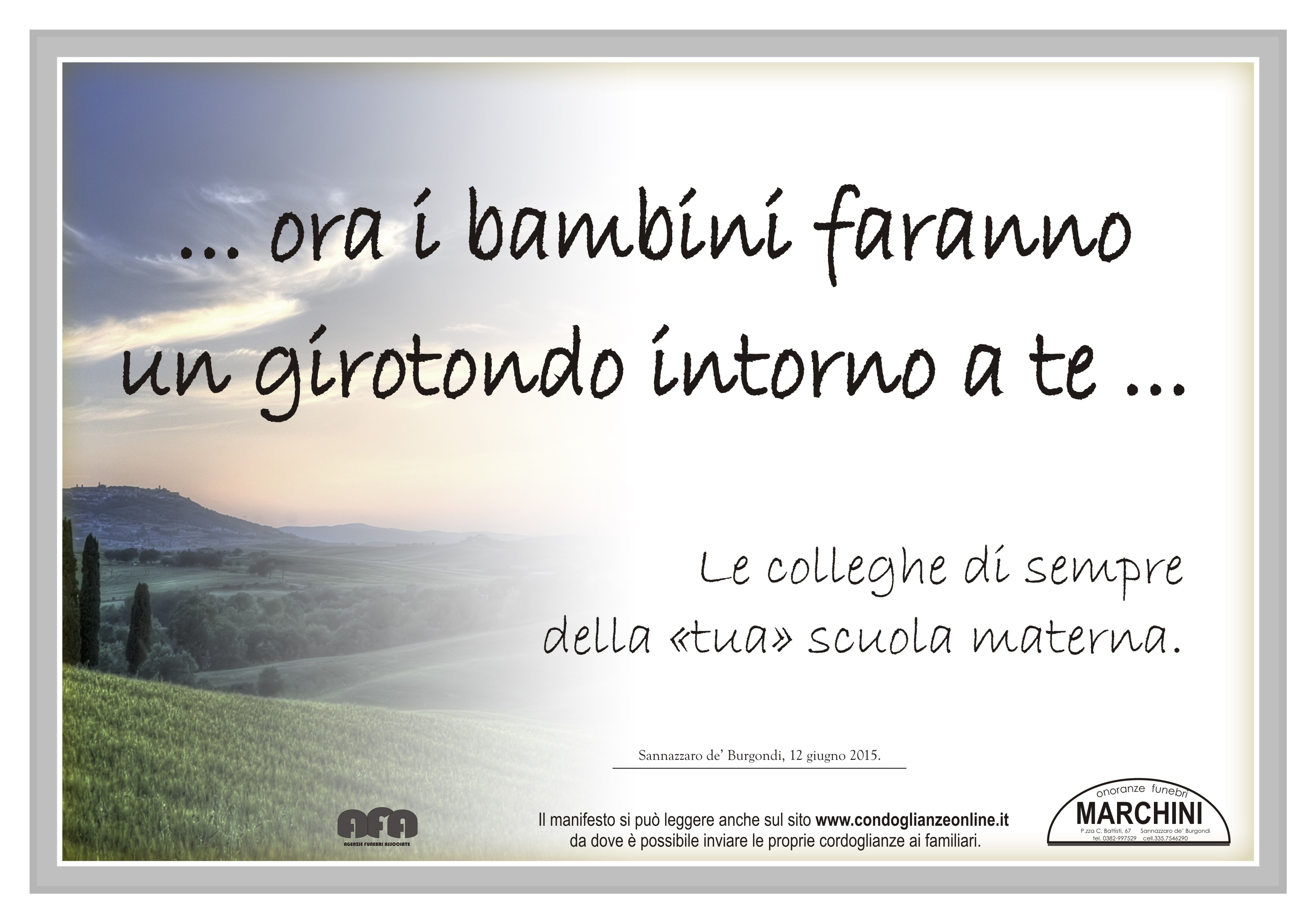 La cara salma riposa nella Sala del Commiato Marchini in P.zza C. Battisti, 63I funerali avranno luogo Lunedì 15 alle ore 14,30 nella chiesa parrocchiale di Sannazzaro de' Burgondi.