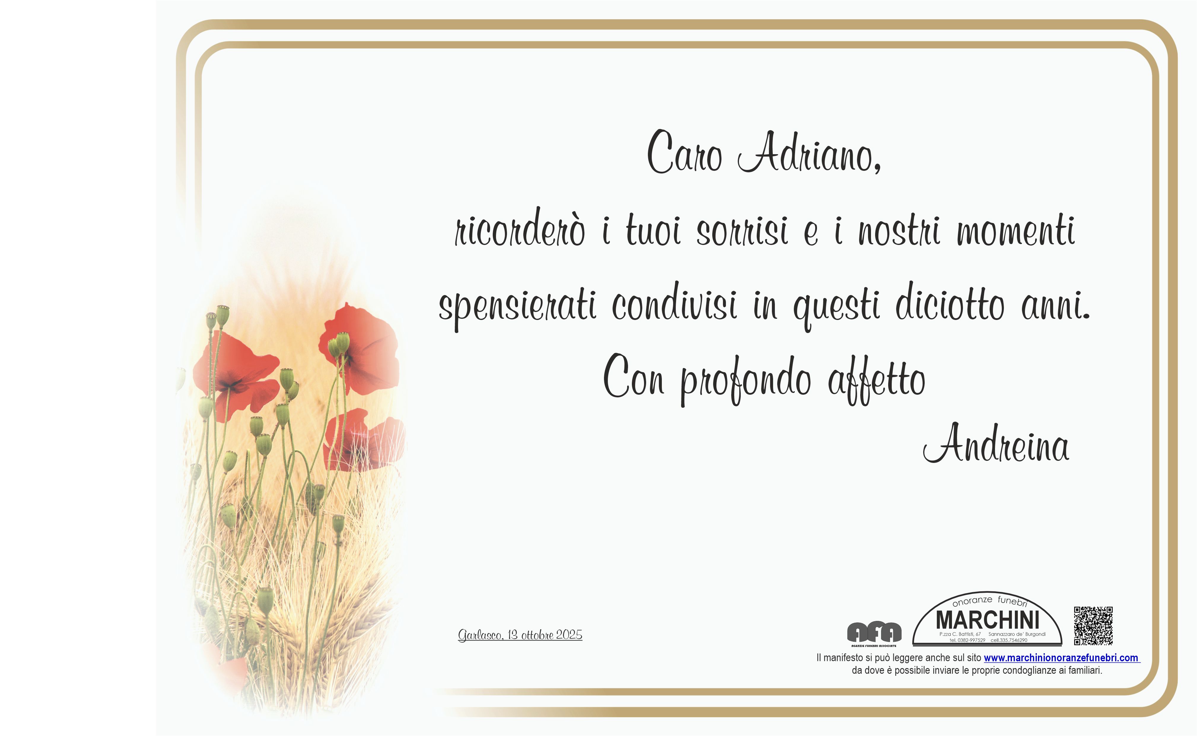 Profondamente colpito dalla notizia, porgo le mie più sentite condoglianze per la perdita del caro Adriano. Famiglia Colla Danilo