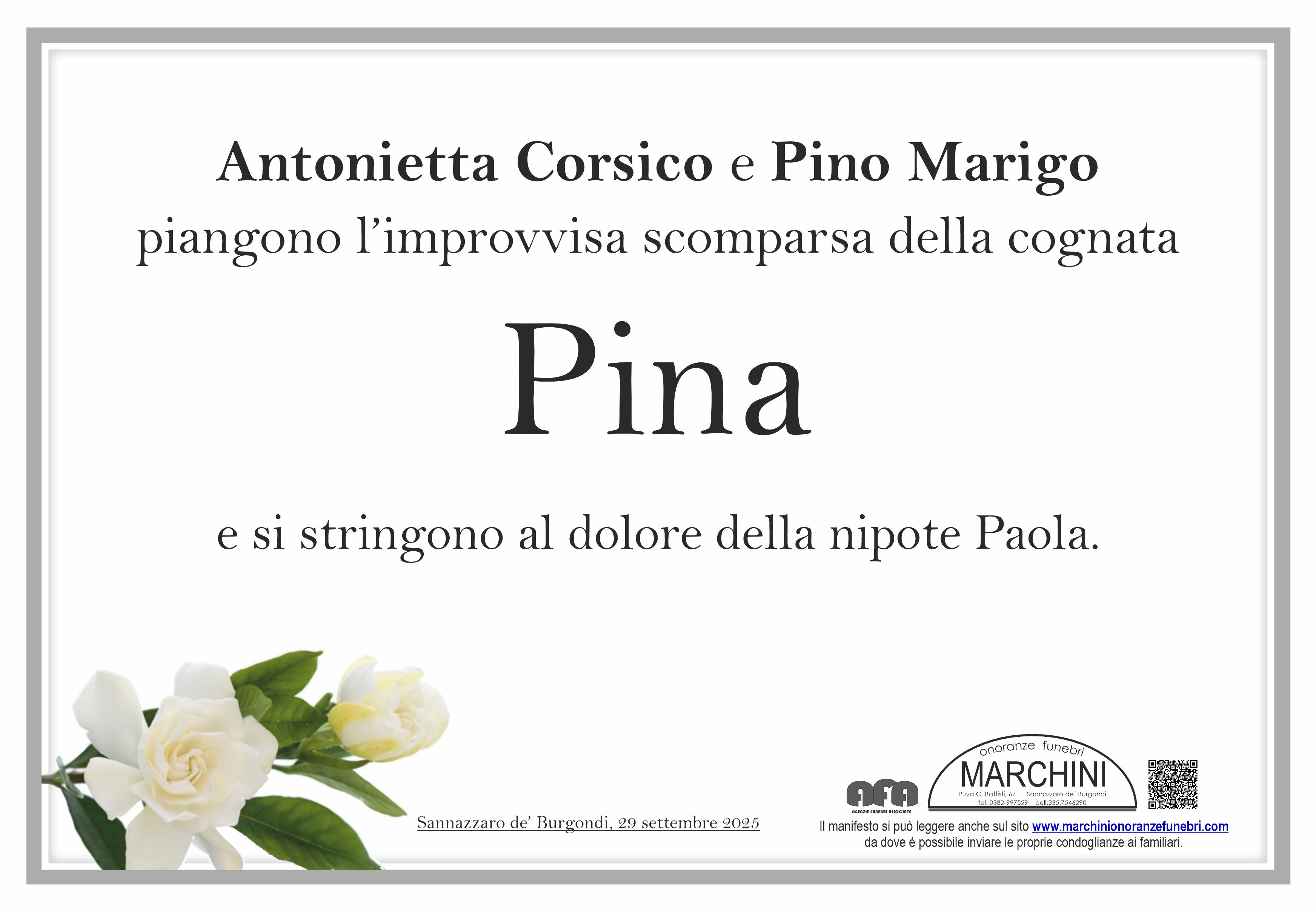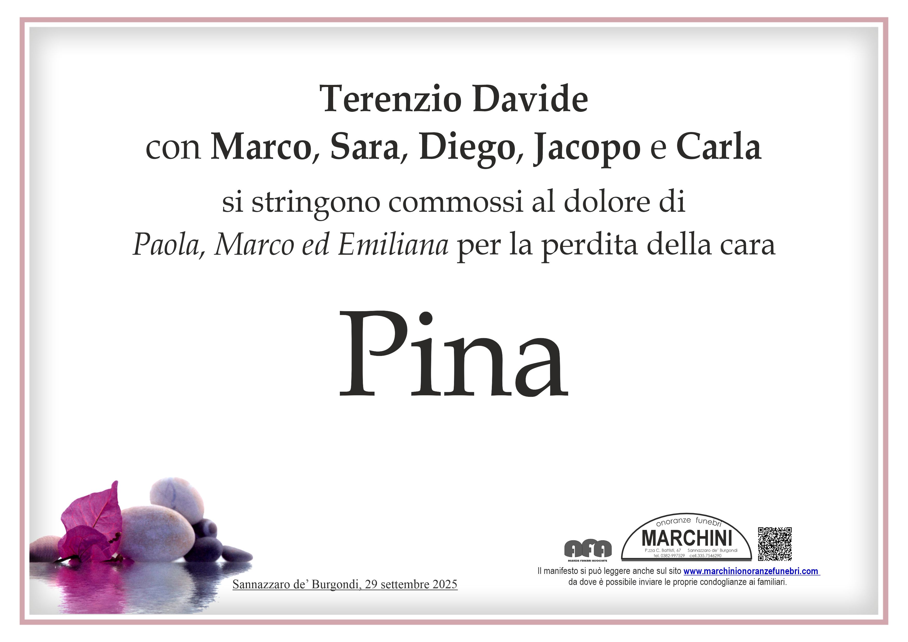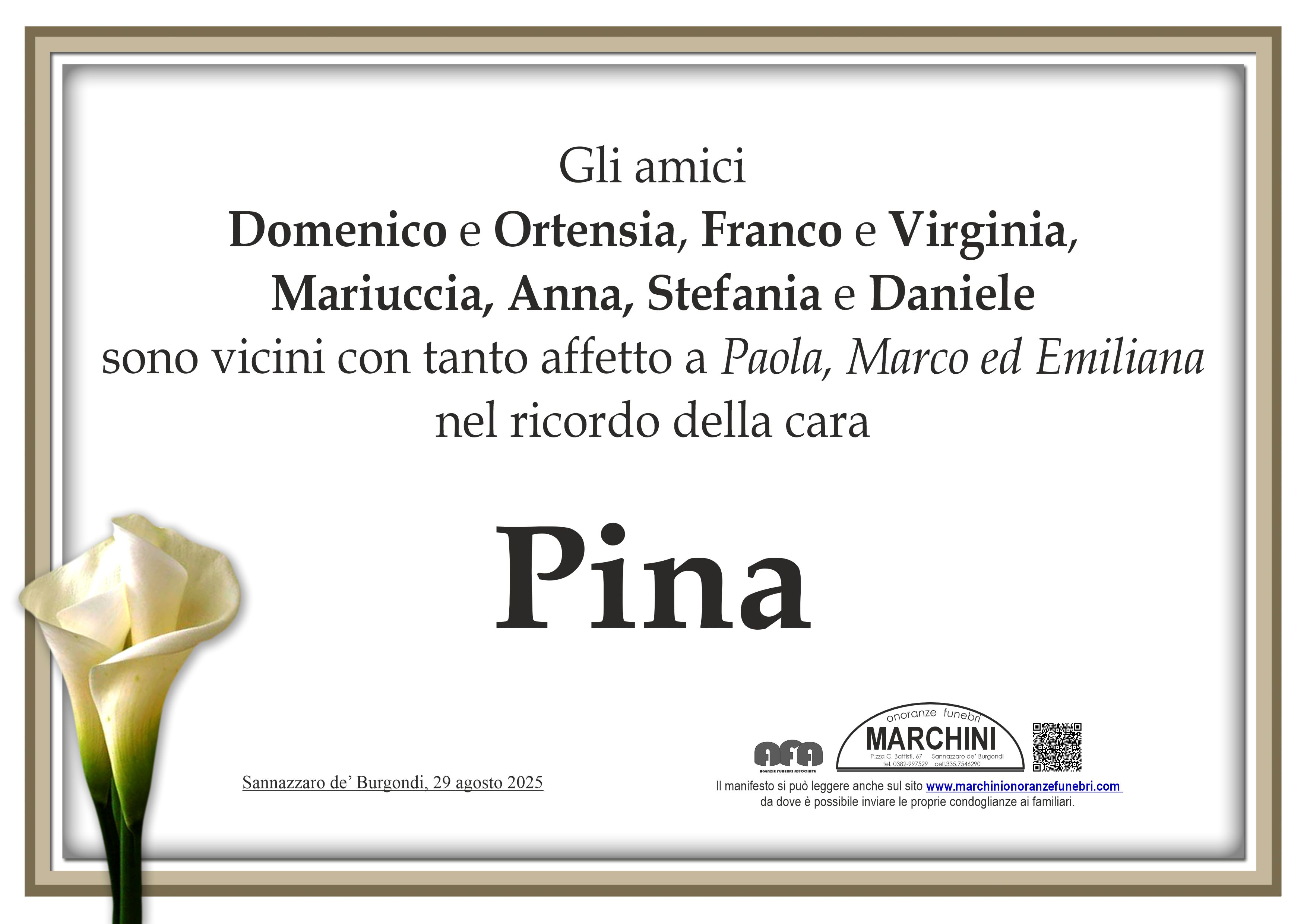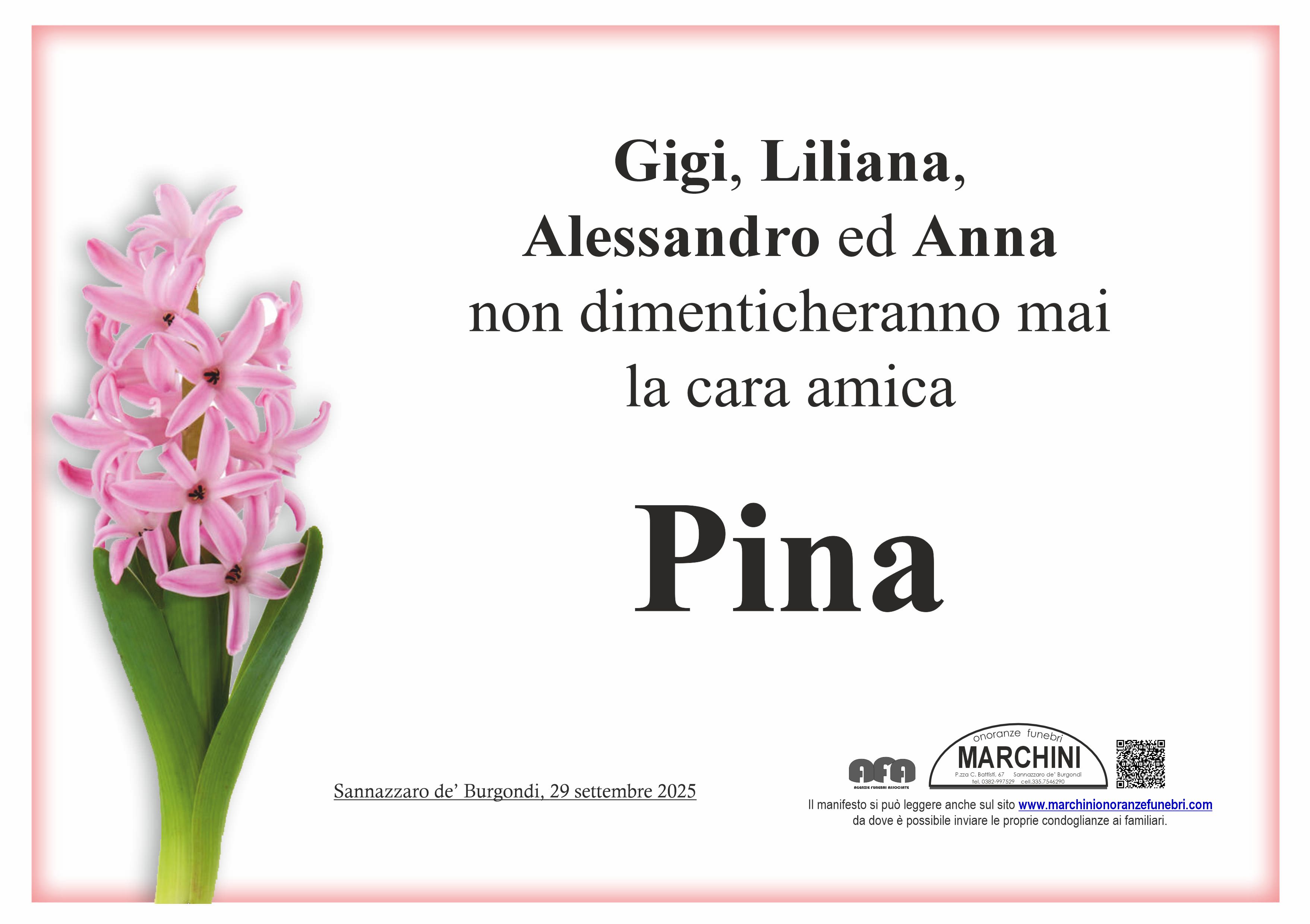 Ricorderemo sempre con affetto la cara Pina;voglio pensare che raggiungerà la mia dolce mamma e finalmente insieme, continueranno a fare i loro meravigliosi lavori anche da Lassù. Vi abbracciamo Roberta e Domenico Bermani