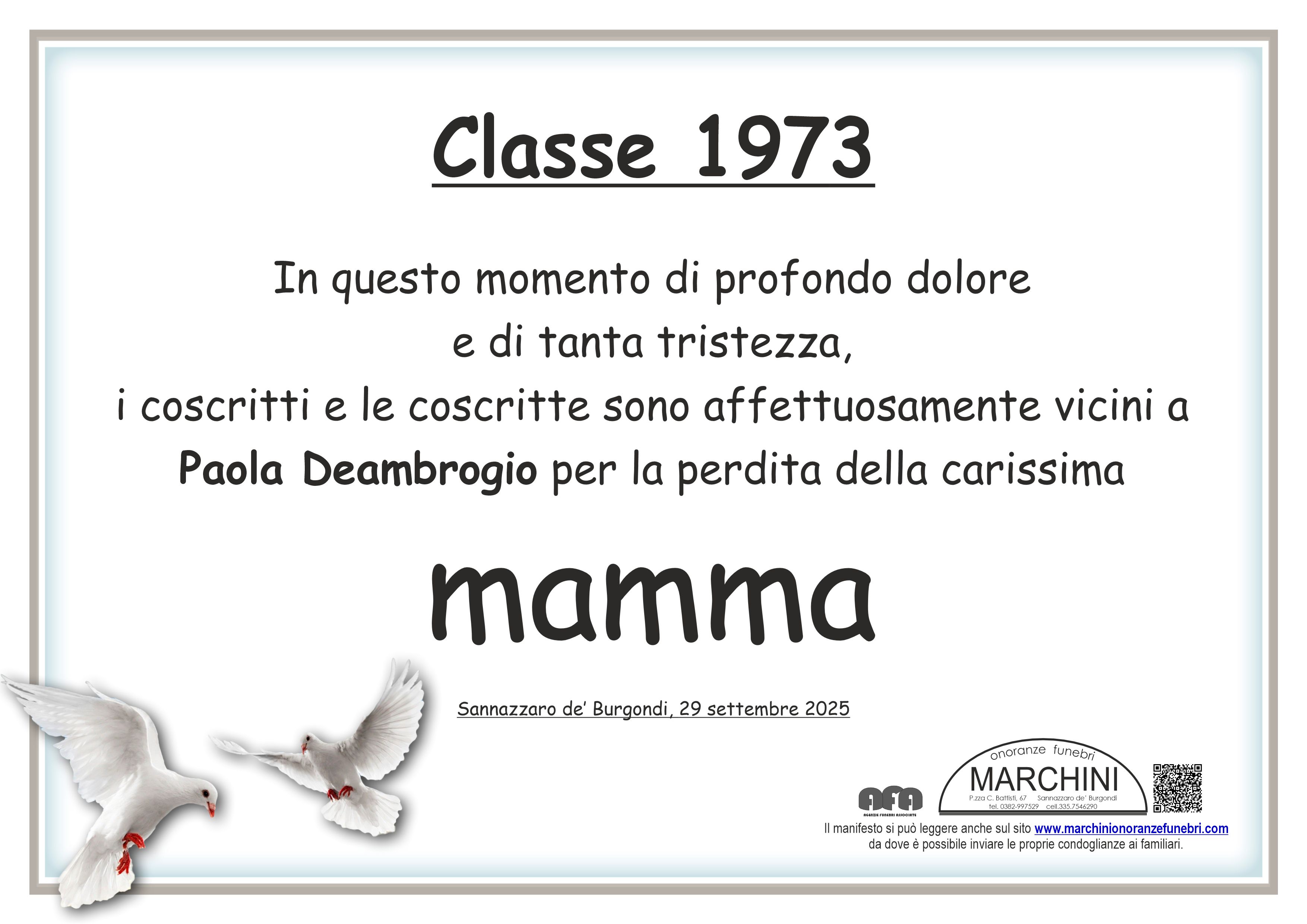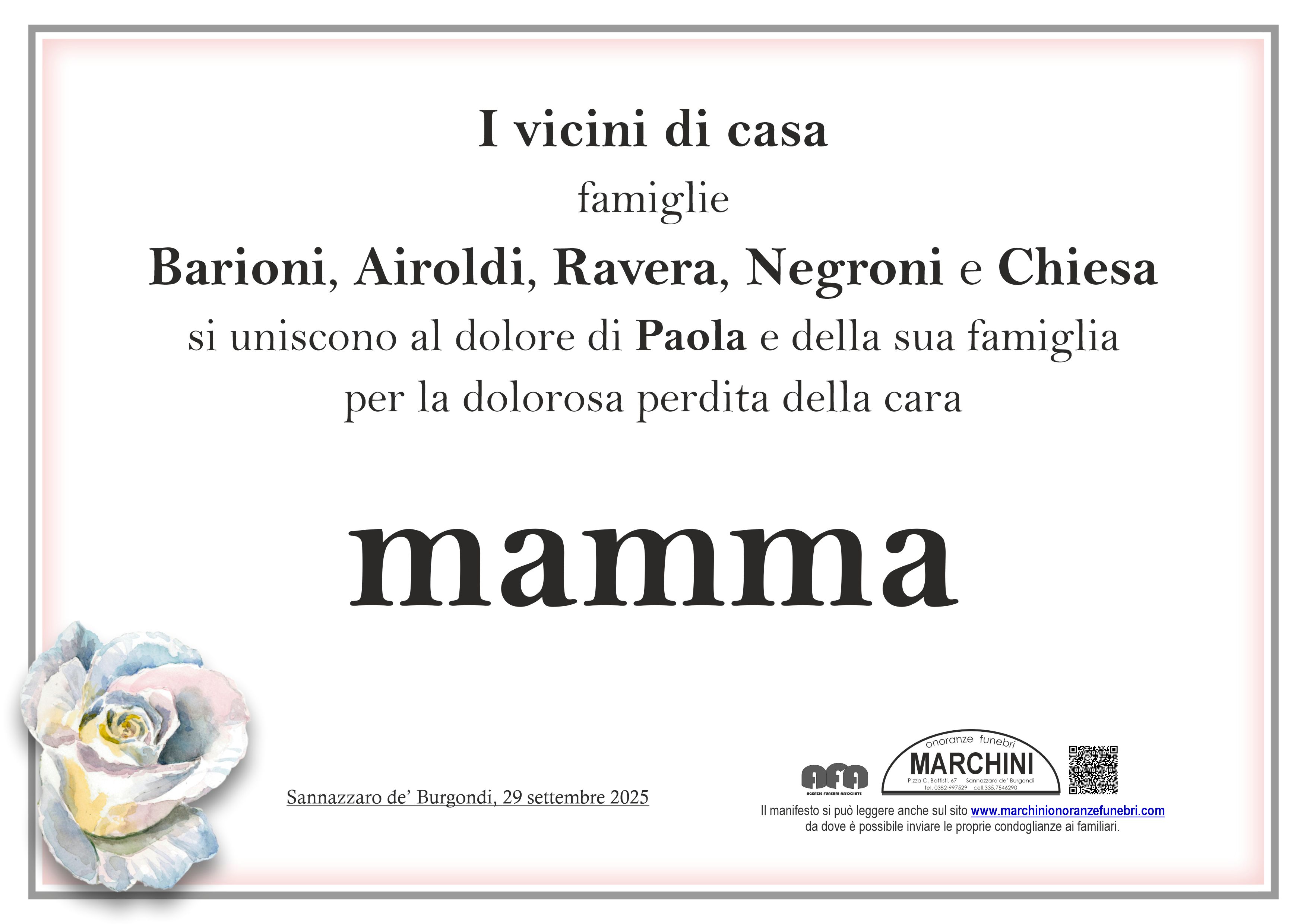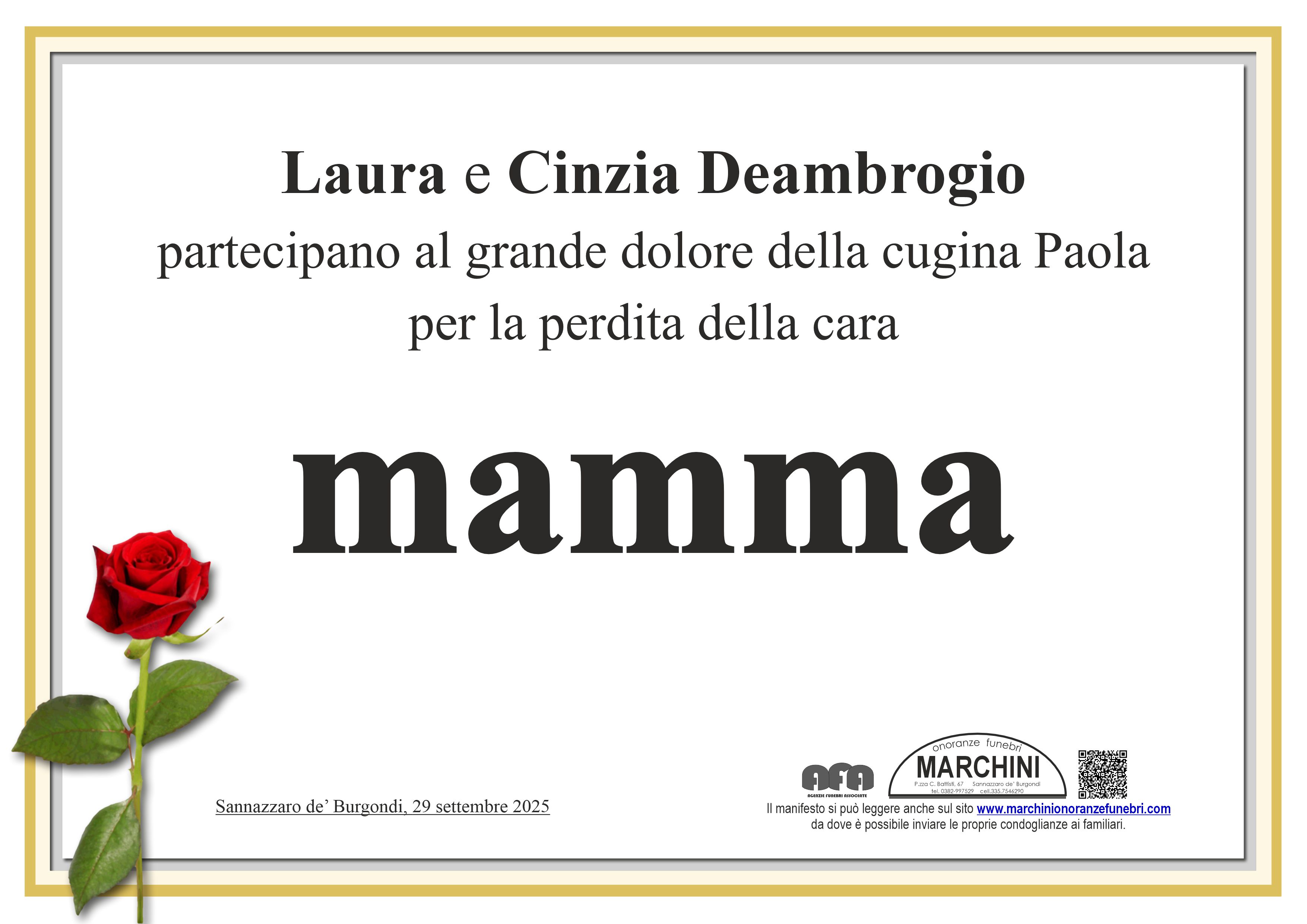 Incredule e profondamente addolorate partecipiamo commosse al vostro dolore, vi stringiamo in un affettuoso e caloroso abbraccio e porgiamo le nostre più sincere condoglianze elevando al Signore una preghiera per lei e per tutti voi affinché possiate trovare conforto sostegno e consolazione in questo tristissimo momento. Pinuccia e Gabriella Sacchi