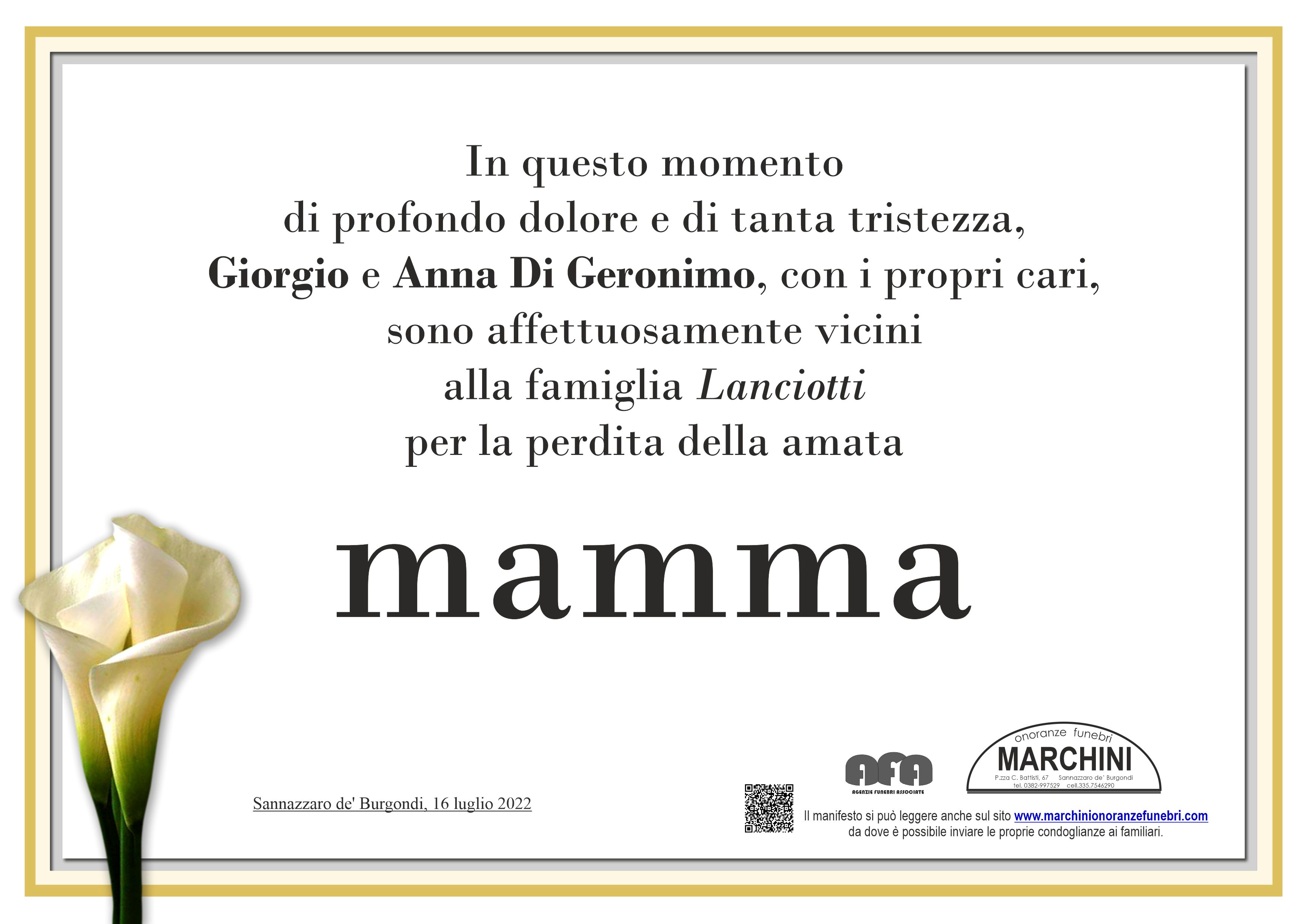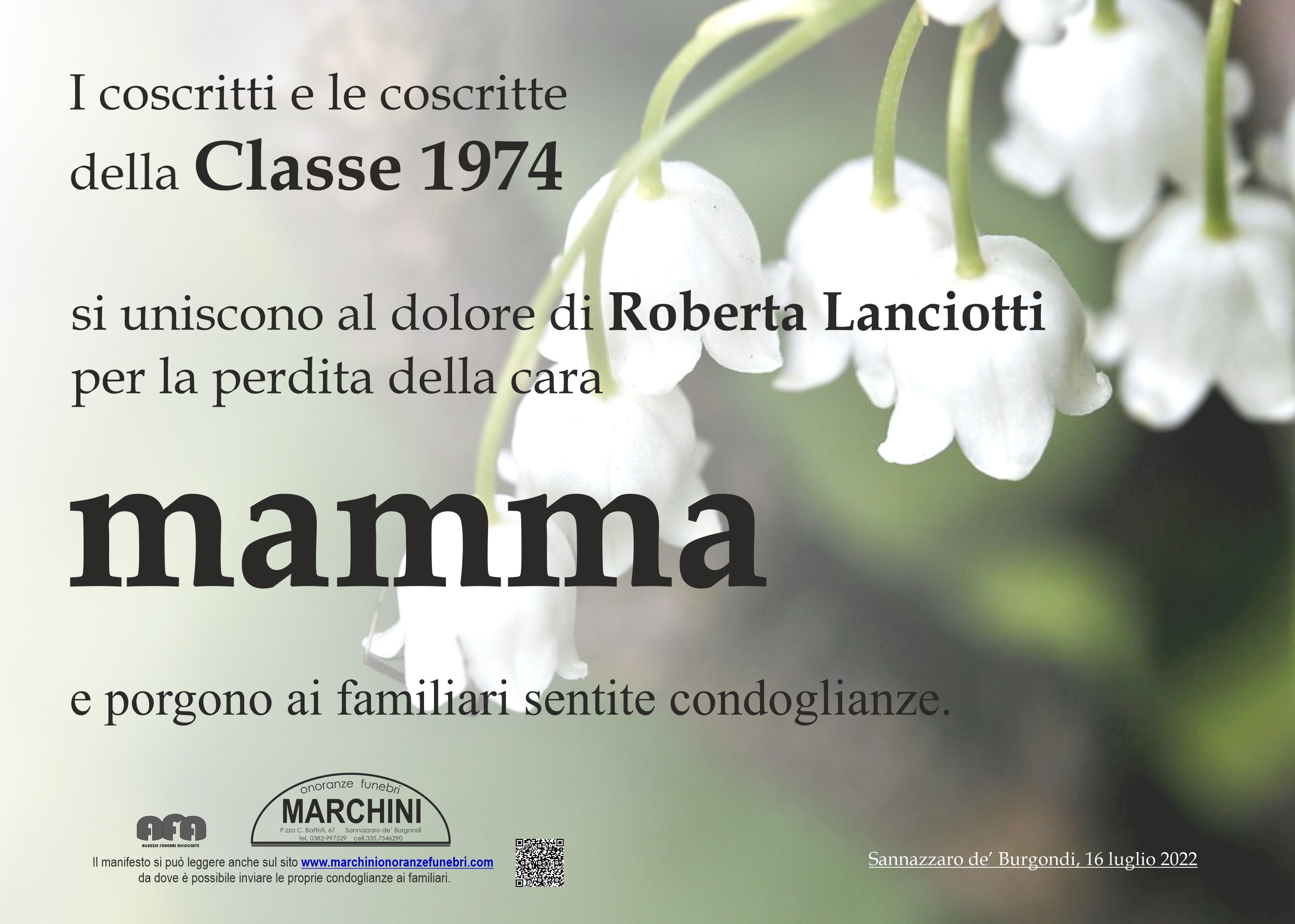 In questo momento di profondo dolore,siamo vicini alla famiglia Lanciotti per la perdita della cara mamma. Antonella, Paolo e Giulia Birbes