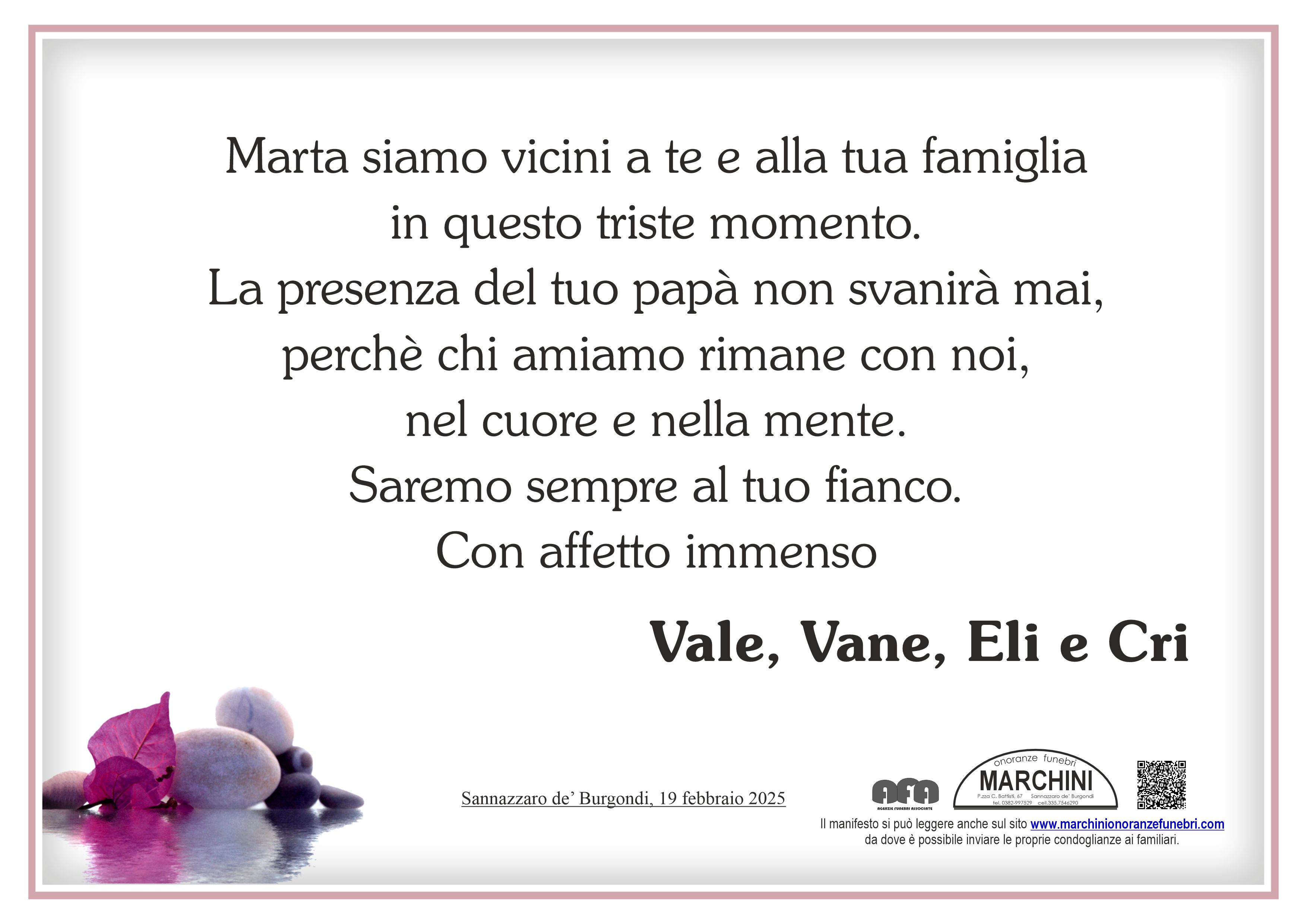 Dispiaciuta nell’ apprendere questa triste notizia, stringo in un abbraccio Marta e la sua famiglia. Sentite condoglianze. Serena